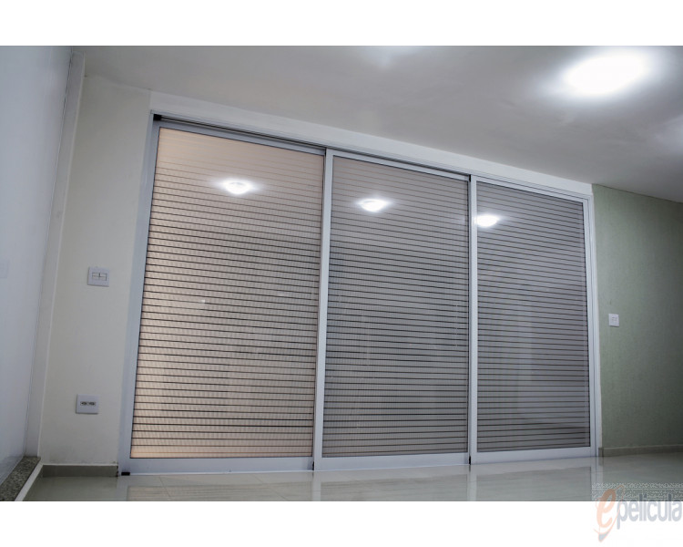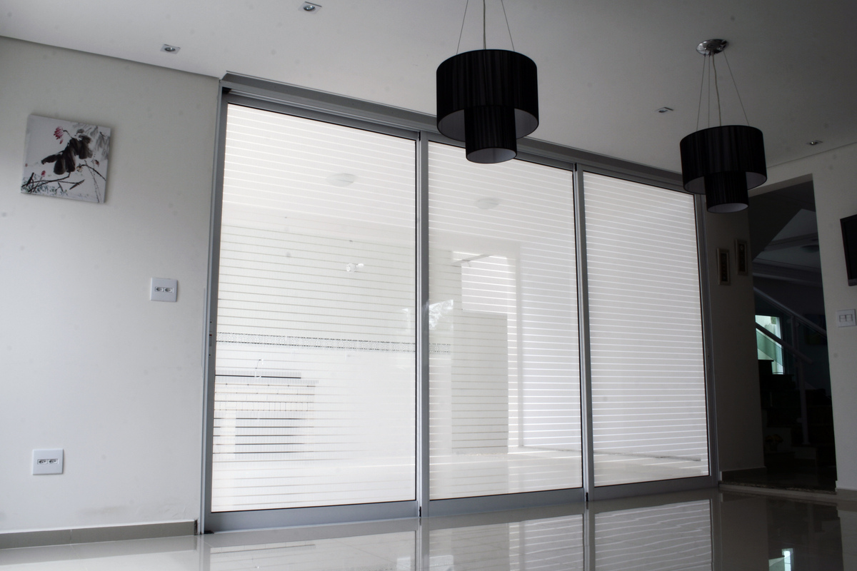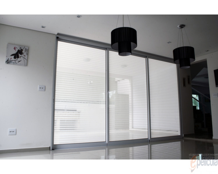 • Linda Película Decorativa Barra Branca 4,0 x 0,5 com instalação Vertical. Agrega ao ambiente privacidade e requinte, elimina 95% do UV e torna o vidro anti-estilhaçante.