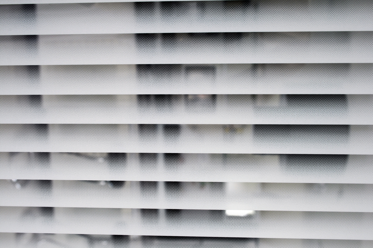 Película Decorativa Listras Degradê Horizontal, efeito persianas parcialmente abertas. Privacidade, controle de UV e moderadamente de Luz Visível.